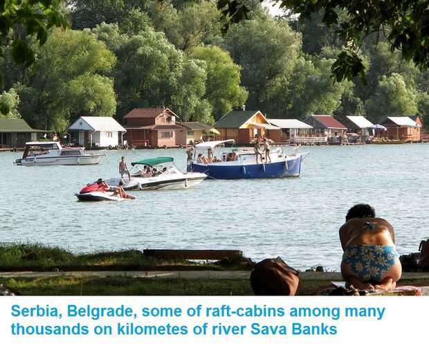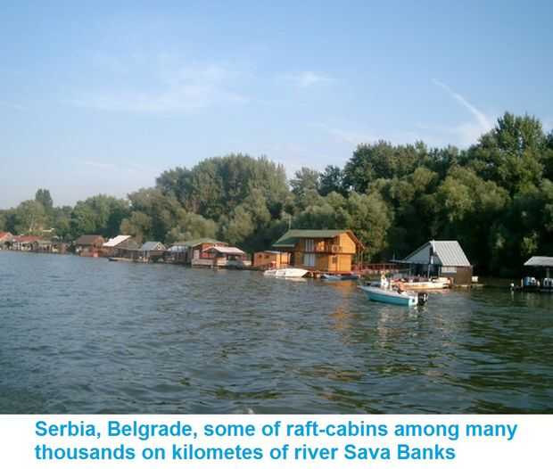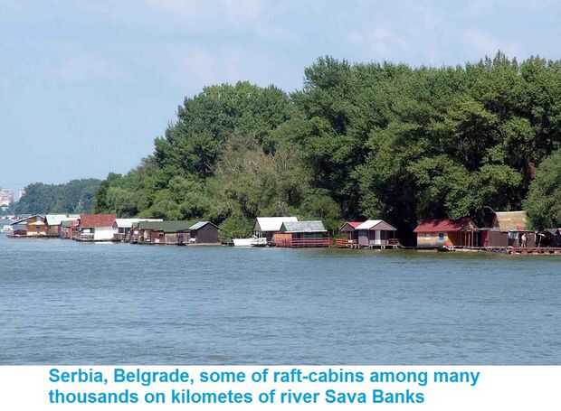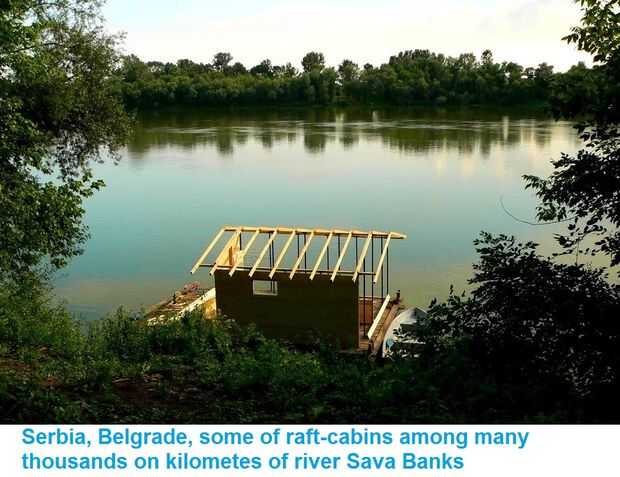 En Belgrado y sus alrededores, hay unas pocas docenas de miles, cabañas río más pequeño o más grande (algunas casas reales), cualquiera se utiliza a veces como restaurantes sobre el agua... Problema es encontrar y alquilar espacio, libre, así que cuando mi hermano compró el lugar a pareja mayor (su cabaña fue tirado lejos por el hielo durante el invierno y terminado nadie sabe donde), empezamos a hacer planes (en nuestra mente) y recoger los materiales y componentes. Nada fue comprado nuevo - de barriles del metal y cables (el de balsa de anclaje a los árboles en la costa), de acero y vigas de madera de 15 cm x 15 cm para el marco base de piso, tableros de piso espesor 2"(espesor de placas mide generalmente en pulgadas), finalmente la pared y techo de material. Todo se consiguió de amigos gratis, lo mismo que aceite de motor viejo para la impregnación de la construcción y las superficies exteriores... Puertas y ventanas fueron tiene forma alguna casa pequeña demolido... Paredes y techo se hicieron como construcción sandwich: marco de 2 "x 1" enrejados, cubierto con las placas de espesor 3 mm, conocido localmente como "lesonit", utilizado sobre todo en la construcción de puertas. Es casi impermeable, pero con aceite de motor viejo es a prueba de agua, al menos para dos década...