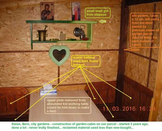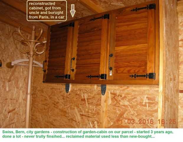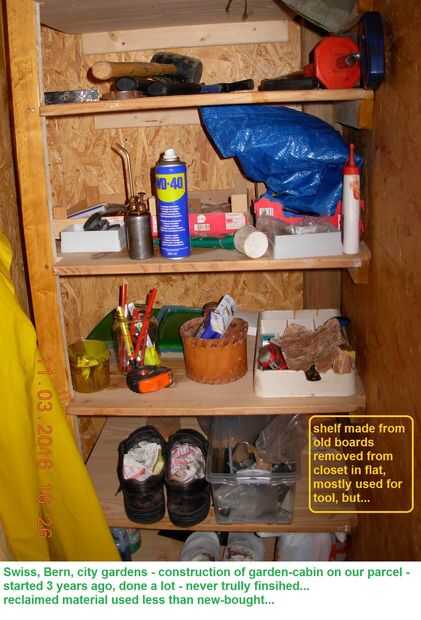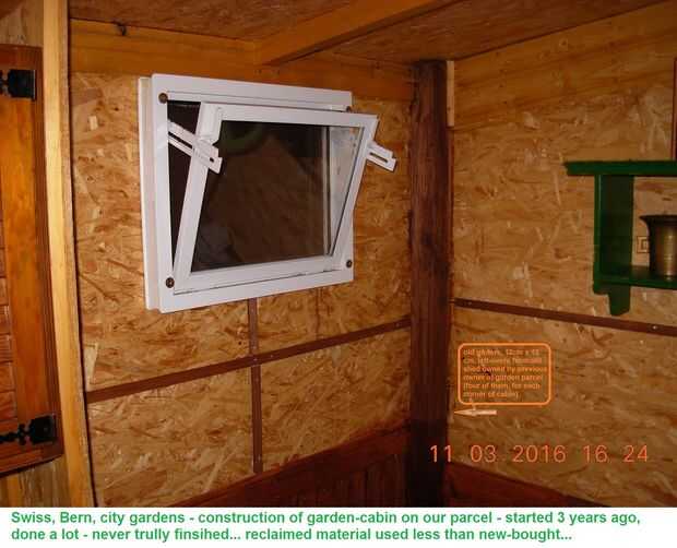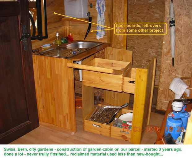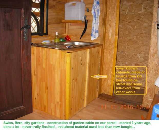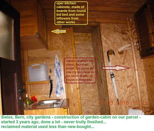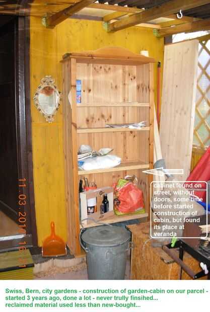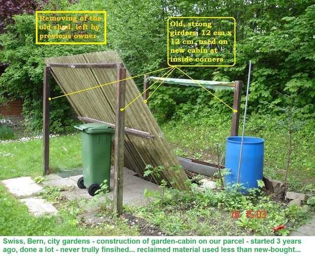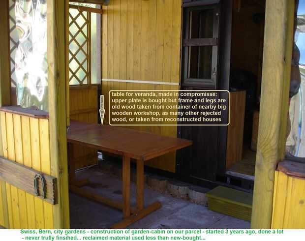 Hace algún tiempo, alquilamos parcela pequeña en uno de los jardines comunitarios en el centro de Berna, Suiza. Podría utilizar más reclamado madera y componentes si los funcionarios no son tan estrictos al edificio en los jardines: todas las dimensiones, superficie, material y color deben estandarizarse, el mismo tipo de "casa de aspecto de estándar".