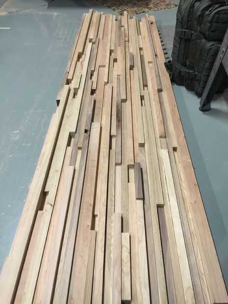 Después de preparar la madera con el cepillo utiliza una sierra de mesa y tronzadora para cortar longitudes y anchuras para cada tabla en cada capa. Una vez más el intento de generar aleatoriedad organizada resultó complicado. He intentado crear un patrón de tratar de separar de la misma anchura/espesor tableros así como mismo tipo de madera. También tratando de dejar otra caída de longitudes en cada extremo de cada capa.