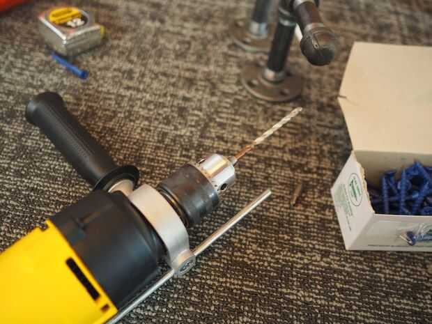Para nuestra pared de hormigón, hemos utilizado un conductor poco y el impacto de albañilería taladros y tornillos para concreto para colgar cada pieza de madera. Dos en la parte superior (uno debajo de donde va la brida, uno a su derecha) y uno en la parte inferior. Son sólidos como rocas.