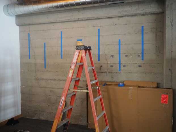 Marque la pared donde va colgando sus estantes. Utilizamos cinta de carpintero azul para bosquejar hacia fuera donde se cuelgan las bicis, dejando 18" horizontal entre cada bici y compensando cada uno 12" verticalmente. Parece que trabajan mucho para el embalaje en bicicletas sin ser demasiado de una maraña de manillar al intentar colgar la bicicleta.
