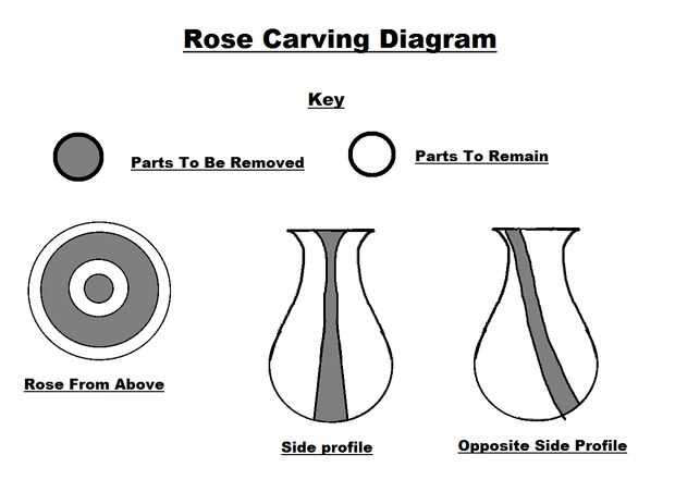 Primero tenemos que marcar qué bits que desea eliminar. Utilicé un lápiz y dibujó dos círculos. Traté de tomar fotos de esto pero las líneas no eran tan claras, así que dibujé un diagrama para demostrar. Sorteo uno de 5 mm del borde de la parte superior de la rosa y el otro justo sobre 1 cm de diámetro en el centro. A continuación dibujar dos líneas hacia abajo los lados de su rosa, idealmente enfrente de lados, por lo que deben tener dos canales dibujados.