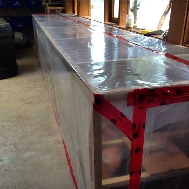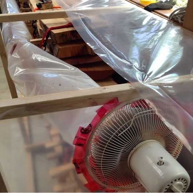 El horno está construido alrededor de la madera apilada y atada sobre un marco de madera ligero que lleva el plástico. Todas las costuras deben sellarse con cinta de barrera de vapor para mantener la humedad en. Corté unos pequeño los orificios de acceso para controlar el deshumidificador y probar el contenido de humedad de maderas en varios lugares. Cinta estos agujeros después de usarlos. La madera seguía siendo en el horno durante 4 meses y alcanzó un promedio de 8 por ciento. Esto es sobre todo 2" arbutus grueso, también llamado Madroño.