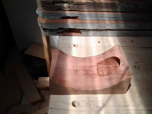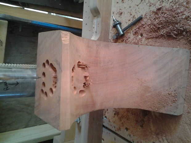 Ubique el centro y perfore un agujero de 2", he usado varios agujeros más pequeños en un círculo, un cincel, escofina y papel de lija para hacer el ajuste perfecto.