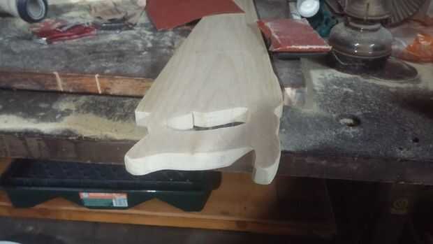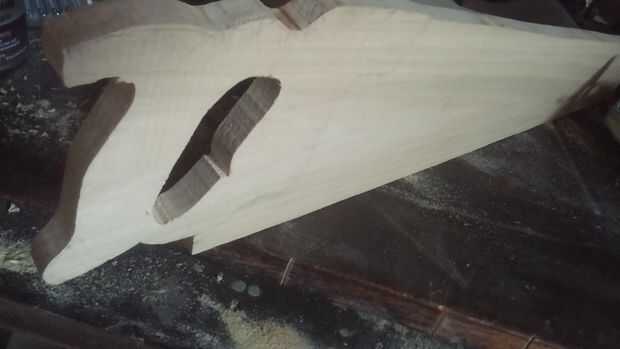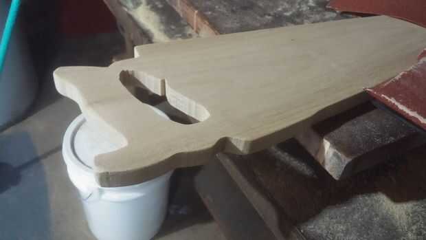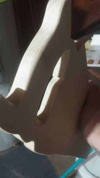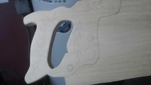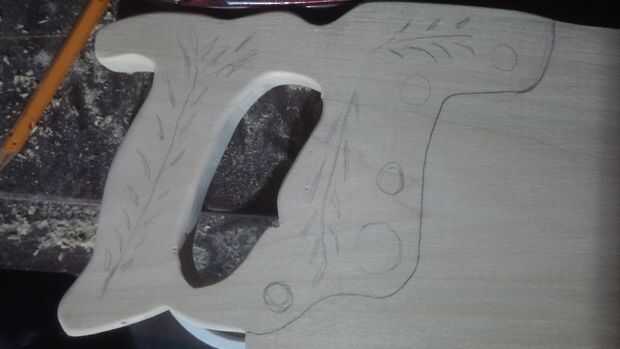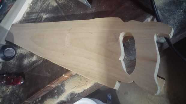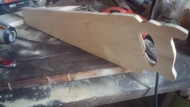 Mantiene siguiendo su diseño hasta que tenga su forma. en este punto tienes un bruto mirando el pedazo de madera con tipo de forma de que usted está buscando. Lo que he hecho para que se vea más como una sierra empezar a darle forma. lo hice con papel de lija, comenzando con grano 50 fue capaz de conseguir muchos de los lugares ásperos y fue capaz de hacer que se vea más como una sierra con mango y hoja.