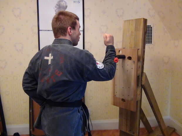 La segunda característica era un tercer agujero para un brazo en la parte superior, va directamente en. En este agujero puse un tornado de energía ejercicio bar ($19,95 de www.KarateKorner.com). Esto permitió algunos combos de huelga de parry muy eficaz. Ver las fotos.