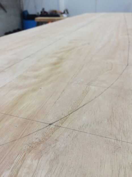 Una vez que has recopilado los equipos comienzan a marcar la plantilla de la forma que quieras en el espacio en blanco. Asegúrese de que marcar arriba y abajo para que pueda mantener la Plaza de los bordes una vez que se corta. También marca un montón de líneas de construcción como una línea de centro (larguero) para usar como una guía más adelante. Mi forma terminada siendo basado en un par de viejas fotos de alaia surf que vi en las interwebs, está sobre la cabeza alto (6 pies) con una nariz redondeada y cuadrado en la parte inferior. Echale un vistazo Tom Wegener Surfboards para algunos otros diseños, la forma es en última instancia hasta usted y cómo usted quisiera montar.