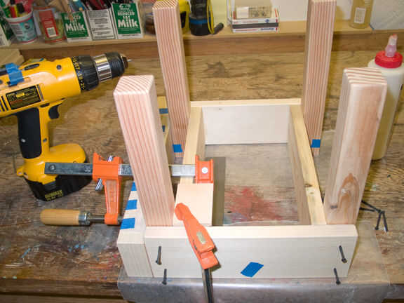 Trabajo trabajo boca abajo, fije las faldas de la final a los ensambles de las patas. Mantener todo al ras. Utilicé tornillos (con perforado agujeros--