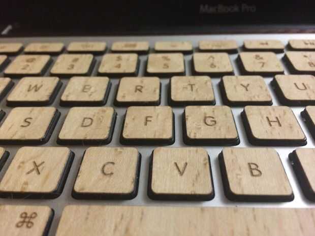 Ahora que las teclas se cortan, es hora de pegar en! Te recomiendo cortar el material excedente porque tendrás que doblar y doblar la hoja para despegarse de estas. También recomiendo usando un cuchillo del exacto porque es fácil de romper estos diluye a lo largo del grano (véase un cierre para arriba de mi tecla de retorno en mis imágenes por ejemplo). Ha clavado el cuchillo a través de la hoja en el borde de la llave, luego presiona el cuchillo contra él por detrás con el lado plano de la hoja presionando contra la clave. Esto levantó cada tecla y permitido para que mí de pelar con facilidad y sin perder el adhesivo. Si las teclas son peeling hasta con dificultad, o el adhesivo no se pegue a las teclas, hay un problema con la configuración de la corte. Para establecer las claves, tuve que hacerlo uno por uno ya que el espacio de mi plantilla es apagado. Yo puedo han sido capaces de utilizar cinta de vinilo de transferencia para hacer todo al mismo tiempo si la plantilla era perfecta. Usé el cuchillo del exacto para colocar las llaves. Me pareció más fácil pulsar la tecla hacia abajo y luego aplicar la llave de madera en la parte superior. Permitido para la alineación fácil. Si la clave es de centrado, se pegará probablemente cuando presione la tecla hacia abajo y es lo más molesto del mundo.