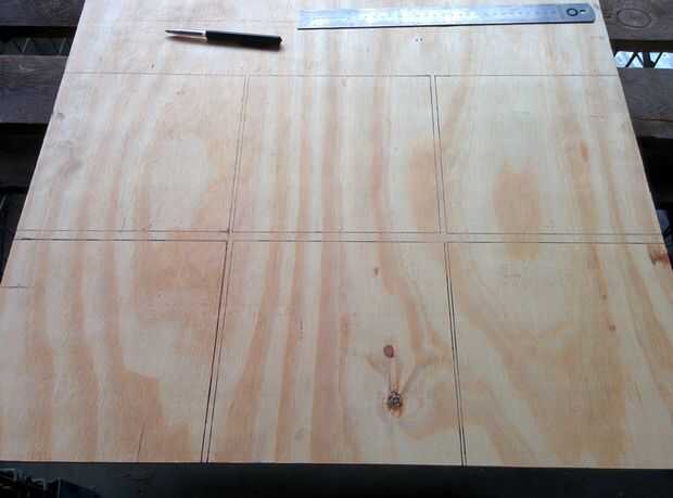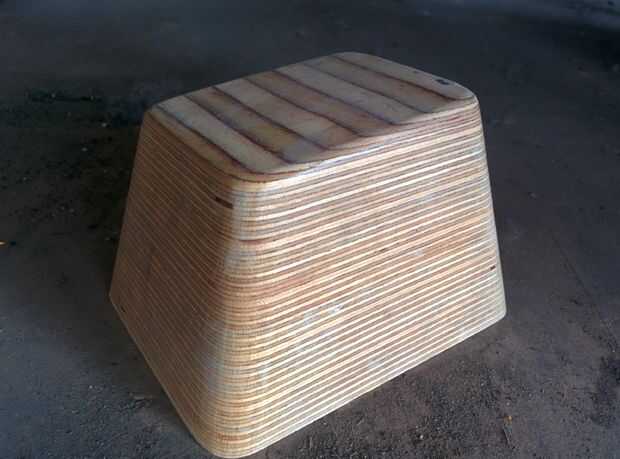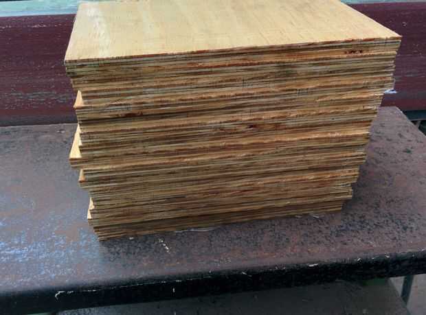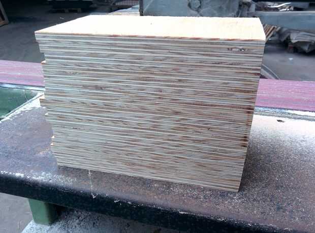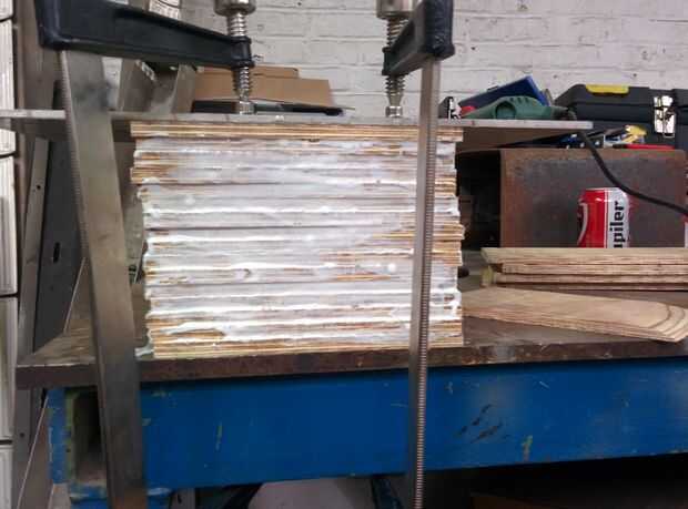 Toma tu hoja de madera contrachapada y dibujar rectángulos. Nos pegan estos y cortar el mango de caña a pie fuera de ella, para no llamar a los pequeños. Tuve un plywood de 5 capas y había pegado unos 16 rectángulos encima unos de otros. En primer lugar, cortar sus rectángulos con una sierra de calar o un cinturón de la sierra si tienes las utilidades. Use suficiente pegamento en los paneles pequeños y colocarlos ontop de uno al otro. Use madera pinzas y pesas para mejorar la resistencia del pegamento. Dividir la presión igualmente como sea posible.