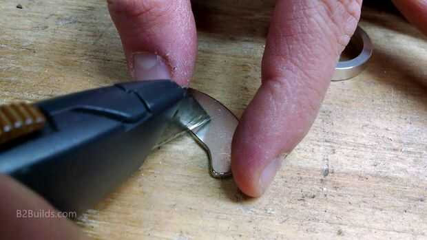 En el eje de la unidad de disco duro, después de retirar la pieza de arriba, usted también podrá encontrar un anillo de aluminio. Mi disco duro tenía sólo un plato, por lo que este anillo era relativamente grueso (aproximadamente 1/4"), por lo que podría funcionar bien para el borde exterior de uno de los imanes. Sin embargo, para colocar el imán dentro de este pequeño círculo, anotó y se rompió el imán por la mitad. Tenga en cuenta que manejar estos imanes con herramientas de metal (cuchillos, alicates/etc) es difícil ya que te quieren pegar. Mantener todo constante y ser consciente de lo que estás haciendo. Además, he leído que tierra rara imanes pueden dañarse por el calor y el polvo puede ser perjudicial, por lo que no es recomendable para cortar con una cuchilla o disco de corte.