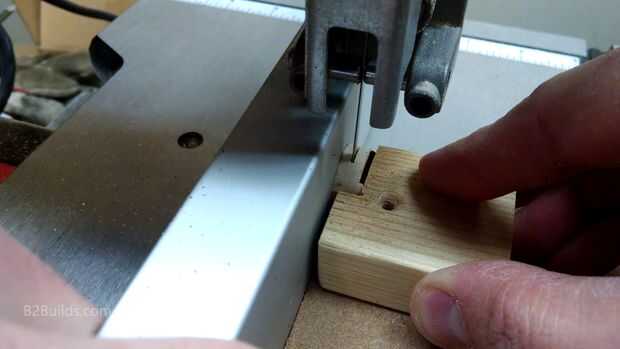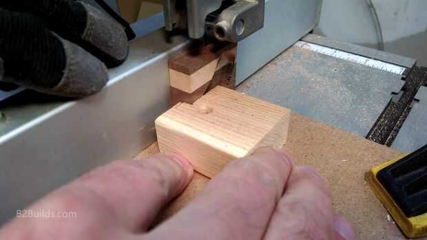Puesto que esto es tan una rebanada fina, solía la valla en mi sierra Asegúrese de que cortar un espesor constante. Para mantener mis dedos más seguro, hice un pequeño bloque de empuje con una muesca en una esquina para mover estas piezas pequeñas a través de la sierra.