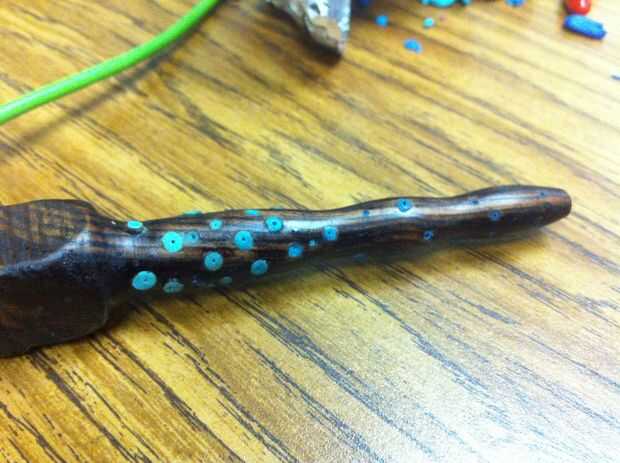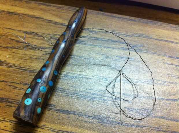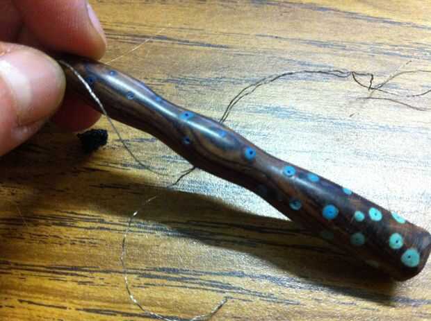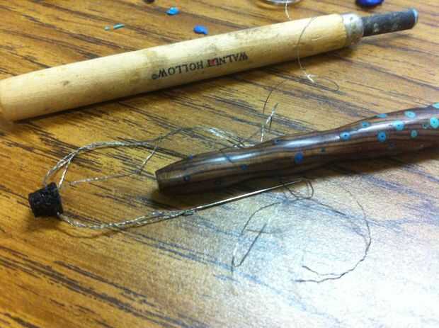 Utilice una aguja de abalorios pequeños con el hilo conductor. Empujar suavemente a través de uno de los agujeros de la aguja y por el otro lado. Utilice unas pinzas finas o un pedazo de alambre doblado para tirar el lazo de hilo conductor hacia fuera a través de la punta de la aguja de madera mientras que todavía van a los extremos del hilo a través de los agujeros en los lados. Recortar el hilo para que una pulgada está colgando fuera de los agujeros de la aguja, luego repita con todos los huecos que atraviesan completamente la madera.