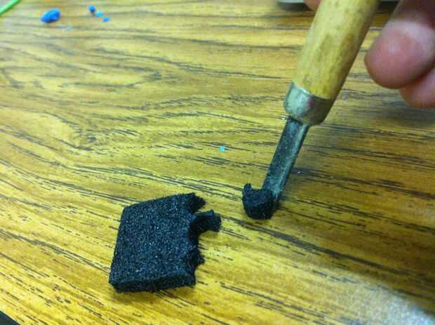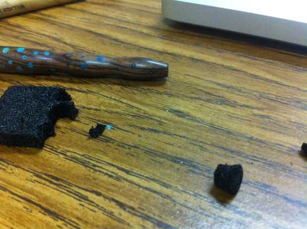Una vez que la aguja es suave como debe ser, corte un trozo pequeño de espuma conductora. Recuerde que si la punta de la aguja es demasiado pequeña, el dispositivo probablemente no recogerlo muy bien. Hemos hecho algunos experimentos con diferentes tamaños para la punta de la aguja, y esto es sobre lo más pequeño posible con espuma conductora todavía lo suficientemente sensible para ser usable.
