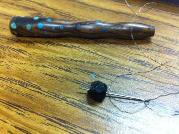 Utilizar una arcilla herramienta, palillo de dientes o cualquier cosa que usted puede encontrar para empujar el hilo conductor dentro de la aguja de madera, luego empuje la punta de espuma en el orificio, para que la mitad se pega hacia fuera. Utilice un poco de pegamento transparente en los bordes de la espuma si le preocupa que caiga.