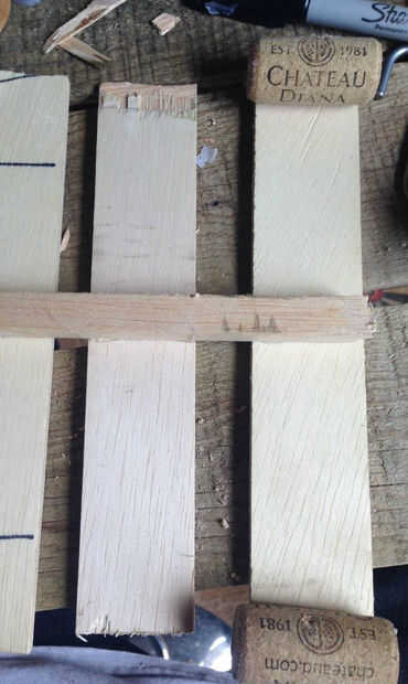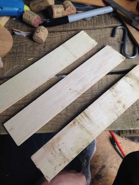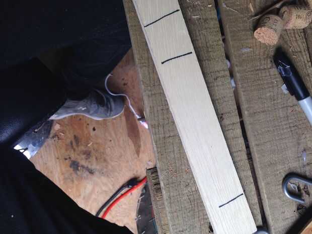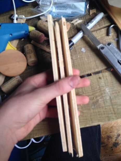 En este paso construiremos el soporte sí mismo. Empecé con un trozo largo de madera artesanal. Se puede utilizar cualquier madera, pero bosque ligero y fácil de usar que son fáciles de cortar y pegar como la balsa, se recomienda. Marque la madera con un rotulador para indicar cuánto tiempo mi teléfono era (iPhone 5). También dejó alrededor de una pulgada en cada lado de la pieza. A continuación, cortar 2 piezas más, la misma longitud y anchura. Se puede ver todo puesto hacia fuera. La siguiente foto muestra que pegué un trozo de balsa en la parte posterior de las 3 piezas a unirse a ellos juntos. Utilicé una pieza más corta, pero puede utilizar uno más largo para un mayor soporte de teléfono. Usted notará también dos trozos de corcho en el lado derecho. Usted debe hacer esto para el lado izquierdo y derecho para que la parte inferior del soporte tiene "pies."