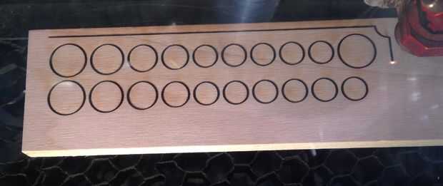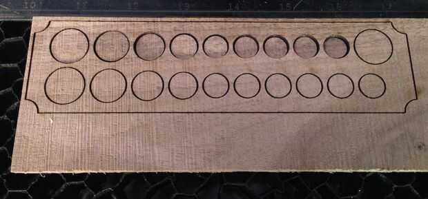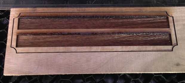 Laser time!  Todas las tres piezas cortan en 100% potencia y 0.25% de velocidad.  Aunque el nogal es mucho más delgado que el álamo, es más difícil para cortar así la misma configuración de láser.  Para crear las cavidades en la pieza base de nuez, efectúe múltiples pasadas de grabado hasta que los rectángulos estén lo suficientemente profundos para dejar las tiras magnéticas sentarse a ras en ellos.  En mi caso tardó 4 pasos en el 100% de potencia y un 30% de velocidad.