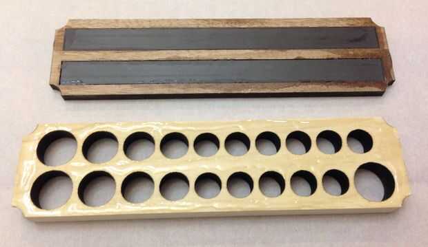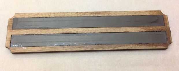 Aunque las bandas magnéticas tienen una tira adhesiva en la espalda, y las bandas magnéticas se ser parcialmente intercaladas entre la base y el cuerpo principal, decidí en epoxy así.  Mezclar un pequeño charco de resina de 5 minutos y extenderlo a lo largo de los bordes exteriores de cada cavidad.  Los imanes oprimida durante cinco minutos.  Tenga cuidado de no conseguir cualquier epoxi en los dedos.  He hojeado la base sobre un trozo de papel de pergamino y presionada hacia abajo hasta que endureció.  Luego de epoxy la pieza media del álamo sobre la base, entonces finalmente la parte superior de la nuez en esa Asamblea.