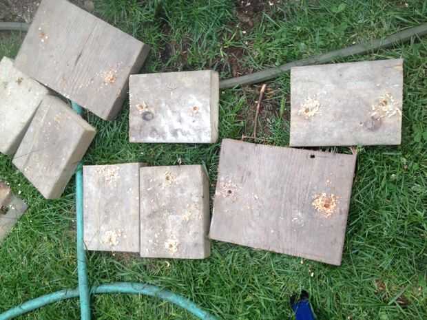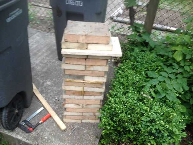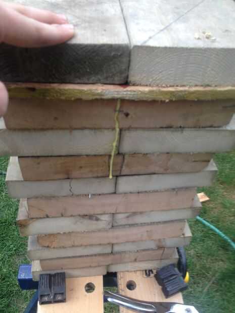 Taladre los agujeros en todos los bloques de manera de la parte a si sus tornillos cortos o no del avellanado no usar orificios piloto para este proyecto y terminó con un montón de despojado tornillos. sólo seguir adelante apilando los bloques uno encima del otro y estar seguro sujetar los tornillos tan estrecha como posible yunques tienen mucha fuerza ellos y necesita el mensaje actuando como una forma sólida no un lío de piezas sueltas. acabé poniendo unas pocas capas de madera contrachapada de chatarra en mantener las secciones juntas y uno que me diera un pequeño estante.