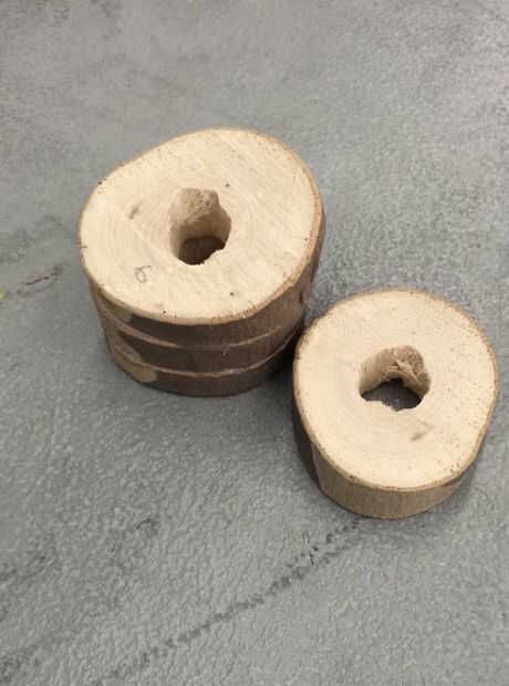Usando una sierra de mano como una sierra japonesa, cortar la rama en los discos, sobre 1/2 una pulgada a 3/4 de pulgada. Utilizar alrededor de 30 discos. Luego, usando un taladro o taladro de columna, hacer un agujero en el centro de cada disco, alrededor de 3/4 pulgada de ancho.