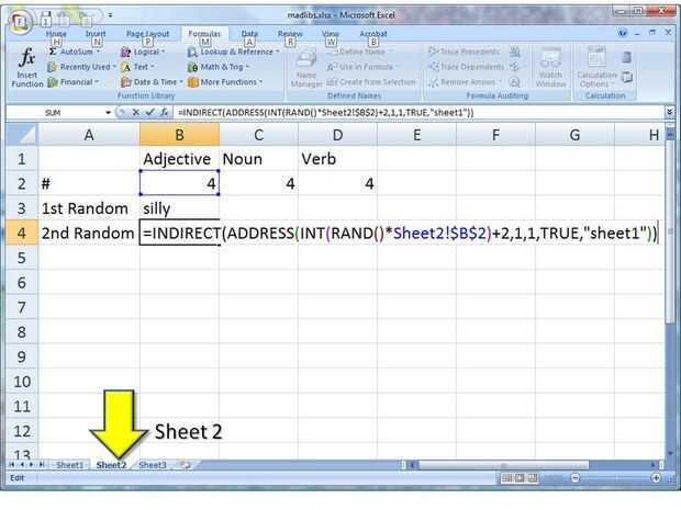 =Indirect(Address(int(Rand()*Sheet2!$B$2)+2,1,1,true,"Sheet1"))