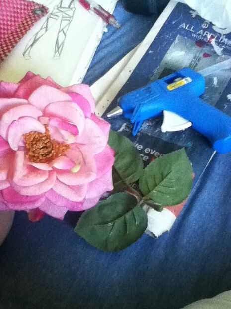 Primero Hágale un agujero (donde usted quiere la flor de una hoja para ir) en el arco. Luego poner pegamento caliente en el agujero y meter la hoja/flor en allí. No tengo ningún acabados fotos del arco y aceite todavía no ha añadido las gemas, pero nose cómo incluso hacerlos jajaja