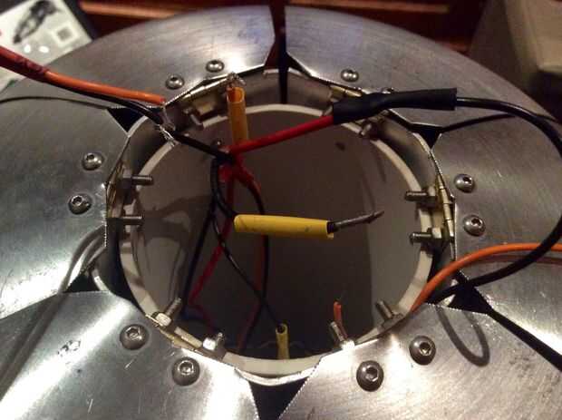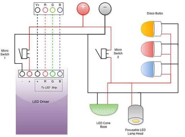 1. De la corriente del enchufe, conecte un cable para el positivo de la tapa inferior de LED, luz superior y lo positivo de cada uno de los focos de discoteca
