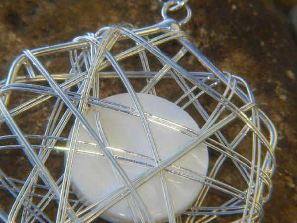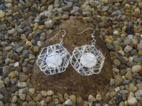 Liso pulido redondo madre de perla 'lunas' parecen flotar dentro de sus cestas de alambre. Cada disco suavemente cuelga de un gancho de plata.