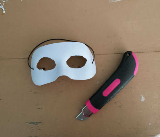 Por lo tanto, si es necesario, cuidadosamente utilizar su cuchillo para agrandar agujeros para los ojos de la máscara. Corta distancia de los dedos. El plástico es rígido y puede hacer que la hoja del cuchillo, así que realmente no quieres cortar hacia tu carne tierna.