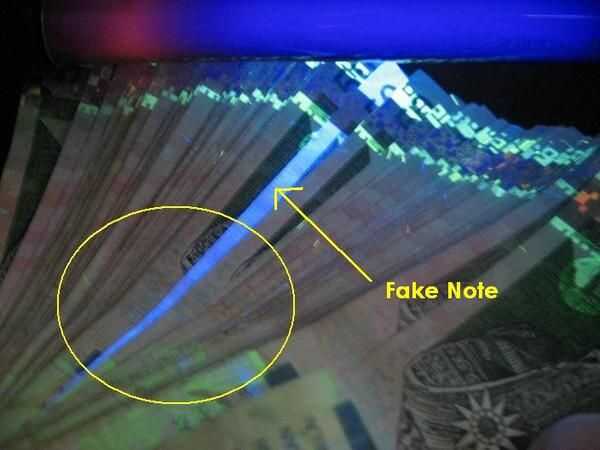 • Imagen 1 - la luz ultravioleta puede utilizarse para detectar dinero falso. El papel moneda se imprime por no emitir fluorescencia como el papel normal. (ver figura 1). Moneda americana impreso desde 2004 tiene una tira de plástico integrada en el papel que brilla bajo luz UV. Las tiras del resplandor azul en billetes de $5, naranja en billetes de $10, en billetes de $20, amarillos en $50, verdes y rojo en billetes de 100 dólares. Porque la tira es solamente visible bajo luz UV, es casi imposible duplicar utilizando incluso las más avanzadas copiadoras de color. Las variaciones de color también ayudan a prevenir el blanqueo de divisas, en que billetes de pequeña denominación son blanqueados y reimpreso para asemejarse a denominaciones más altas.
