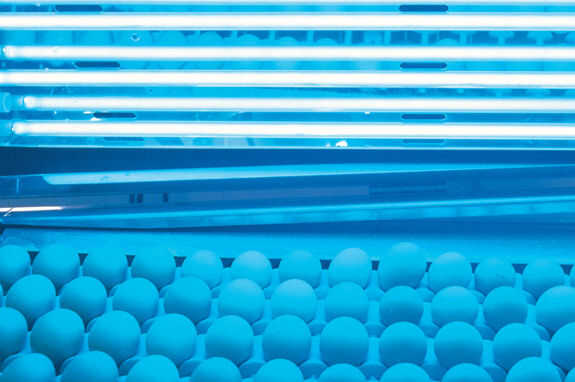 Luz ultravioleta puede utilizarse para matar bacterias, microorganismos, moldes y hongo. Aquí se utiliza para matar las bacterias en los huevos. Esterilización UV es de uso frecuente en sistemas de purificación de aire y agua, acuarios y estanques, laboratorios y producción de alimentos y bebidas.