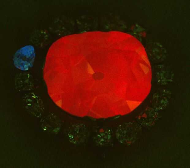 Foto 2 - el diamante de la esperanza azul emite un color rojo sangre brillante UV inferior. Casi todos los diamantes fluorescencia azul.