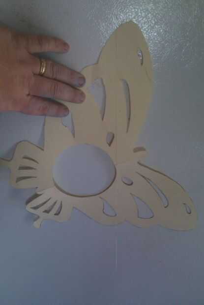 Lo primero que quieres hacer es sacar la mitad de su patrón en una vieja carpeta de archivo de manila.  Asegúrese de que hacer el patrón de abajo donde dobla así que cuando se despliegan tienen la mariposa completa.  (Piense en copo de nieve de cuando estabas en el jardín de la infancia) Luego recórtalo. Una vez que se despliegan tendrá su patrón completo.  Asegúrese de hacer un agujero gigante en el centro de la luz.  He utilizado cristal de un McDonalds.