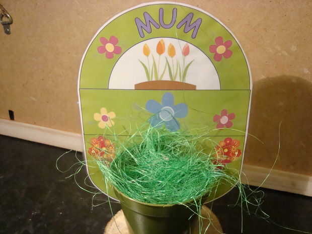 Luego decoré el bote con algunas formas de espuma para darle un ascensor, usted podría recortar tarjeta para deletrear su nombre de las mamás o una forma de flor y color en y palillo él abajo con cinta de doble cara o normal cinta para usted!