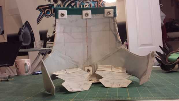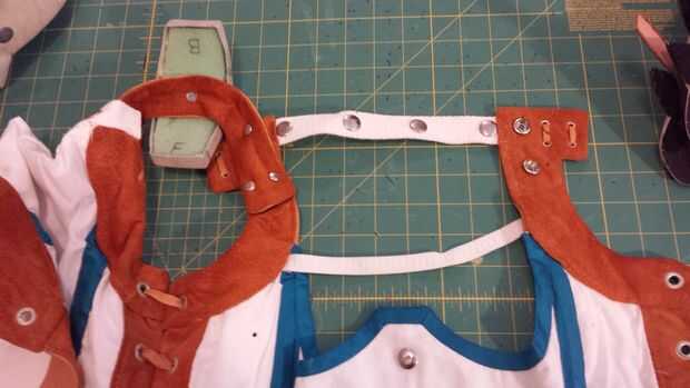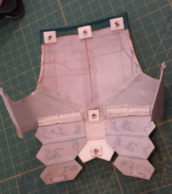 Yo busqué hasta que encontré este sitio, con una muy detallada guía paso a paso con fotos de cómo pueden trabajar las correas y broches de presión para la armadura.