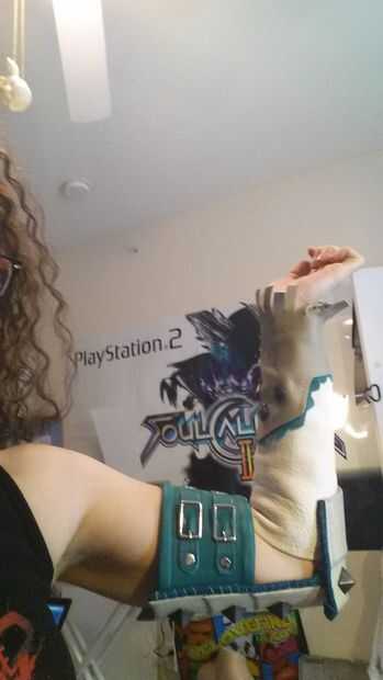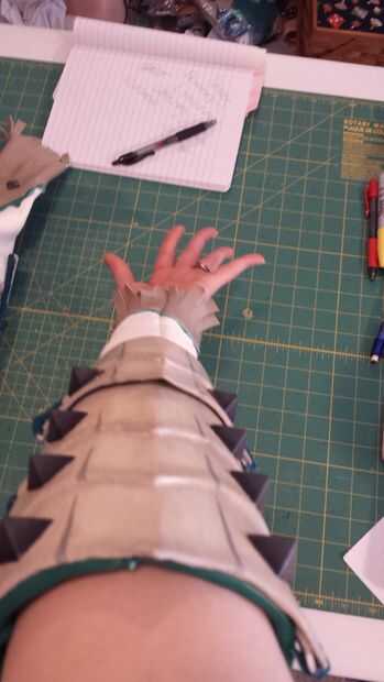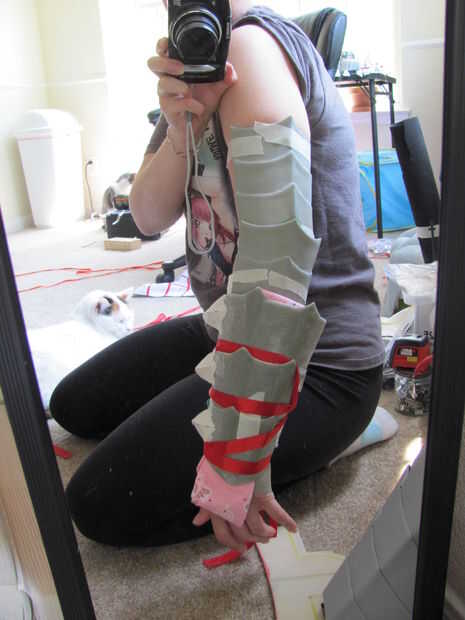 Lo verde es espuma de alta densidad de JoAnn que tanto eleva la sujeción suficiente para darle el aspecto que quiero, pero también proporciona la fricción y mantiene la sujeción en su lugar. Que mantiene el brazal en su lugar, que soporta la armadura del brazo. (foto 10)