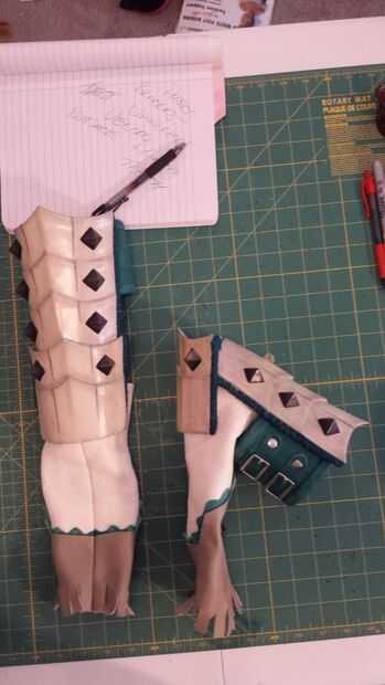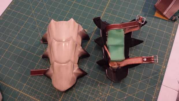 Los brazales de blindados han manchado/pintado atar con correa de cuero con hebillas para mantenerlos en su lugar sobre los brazales de cuero. Se han sentido en la parte inferior de las garras (como bajo el kunai) para tratar de impedir que arruina las cosas tanto como me muevo.