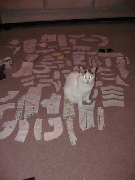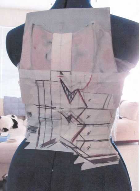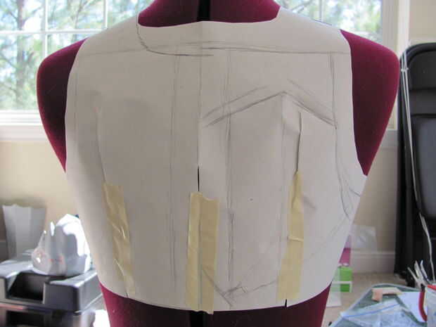 Toda armadura más fina (Gola, los hombros, las costillas delantera y trasera, espalda superior, muslo, cosas de aleta superior e inferior de la rodilla, mandíbula) fue modelado en papel, espuma, cinta adhesiva o todas las anteriores (fotos 3-7) de varias revisiones y las conexiones de prueba de mi dressform y yo. Una vez las plantillas de cualquier forma y tamaño que quería, transfiere las formas de la plantilla a una hoja de Wonderflex (va adelante abreviado como WF), córtelos hacia fuera y cubrió todas las piezas WF con 3-5 capas generosas de resina de poliéster.