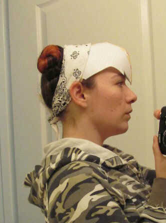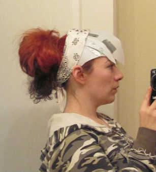 Después había cosido las tramas adicionales en la parte trasera de la peluca, añadí arcos de tela cubierta deshuesado cada tantas pulgadas horizontalmente, como un Bumpit, bromeó y hairsprayed de tanto volumen como podía manejar. (fotos 14,15)