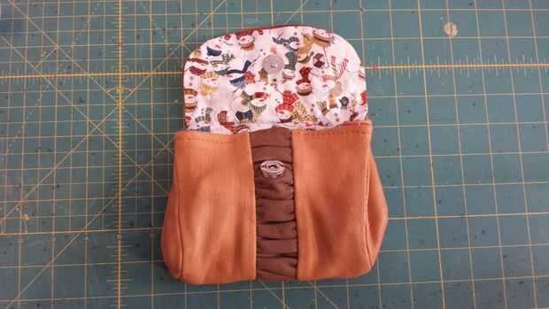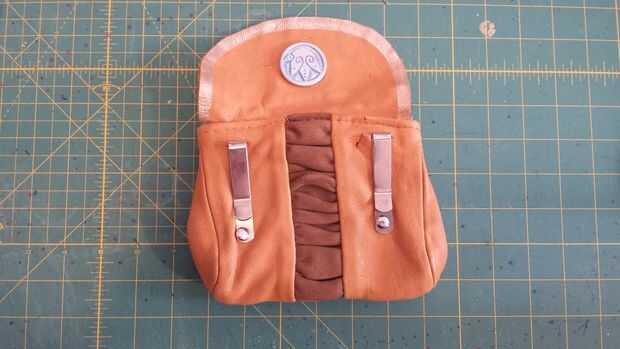 También hay una pequeña bolsa en el cinturón trasero, hice mío en piel de ciervo (Foto 9), forrado en acolchado de algodón en un muñeco de nieve * impresión (foto 10). Yo había estampado hacia fuera en Muselina primero entonces agregan el panel central de piel más oscura acanalada. Hay dos clips de cinturón de cuero de Tandy clavados en la bolsa de manera que fácilmente puedo deslizar en el resto de las bandas.