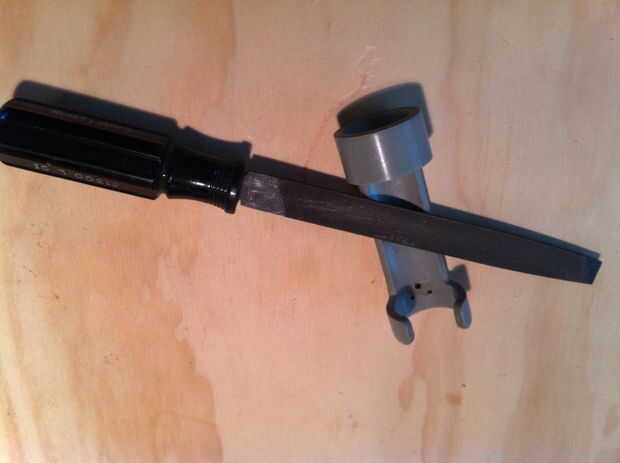 Ahora, en el anillo de 1/2", necesitará realizar un relieve cortado para permitir que el Mag-Lite recortar en la funda. Opté por cortar 1" pieza de la parte delantera a la parte posterior del espejo y redondea las esquinas de mi corte con una Lima. Una vez que todos los cortes se hacen, se enfrentarán todos los cortes con un archivo y la arena de cualquier marca de sierra/archivo.
