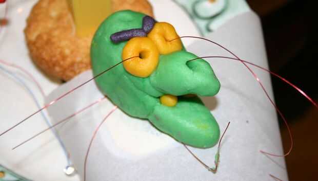 Poner alambre del imán (o cadena) a través de los orificios de la nariz y ojo.  Se trata de "tirar" cable para ayudar a situar los LEDs en su lugar.