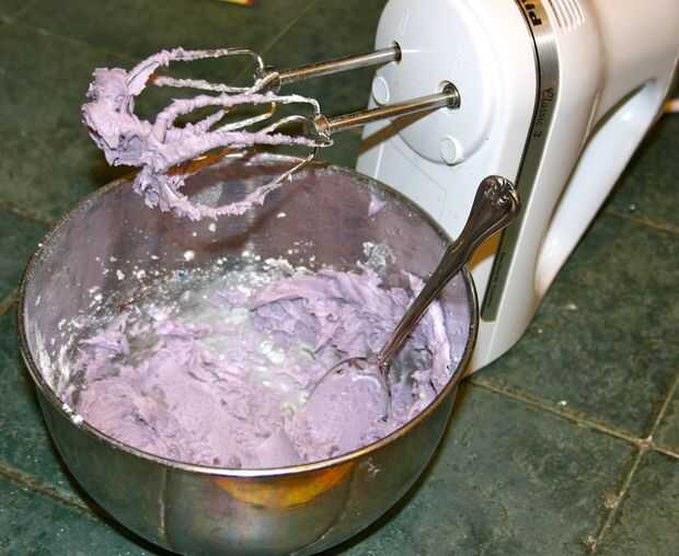 Usando una mezcla eléctrica, hasta helar crema ingredientes es suave. Añadir 6 gotas de rojo de colorante y 4 gotas de azul y se mezclan para helar púrpura.