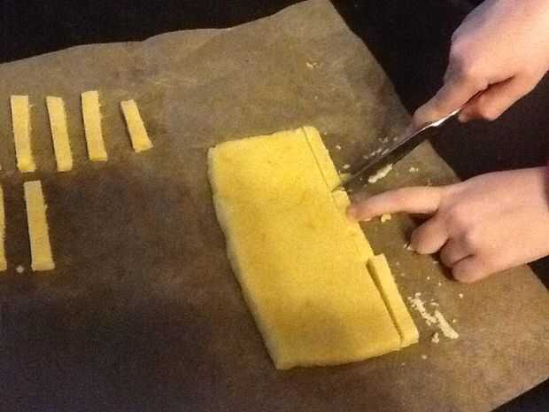 Revolver todos los ingredientes excepto la harina y el almidón. Después de mezclarlos, añadir la harina y el almidón también. Entre dos hojas de papel encerado, extender la masa de 0,5 cm de grosor (lo siento por mi inglés, la olvidé un poco). Luego, poner la masa en la nevera y espere una hora. Retire la masa de galleta y cortada como papas fritas. Poner en el horno a 180 oC durante 8-10 minutos.