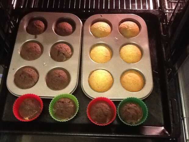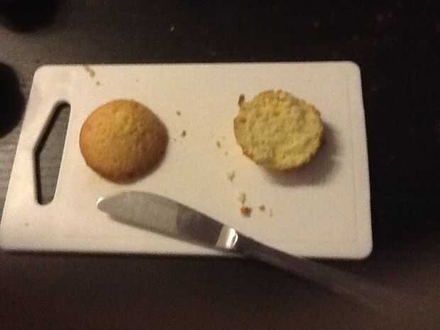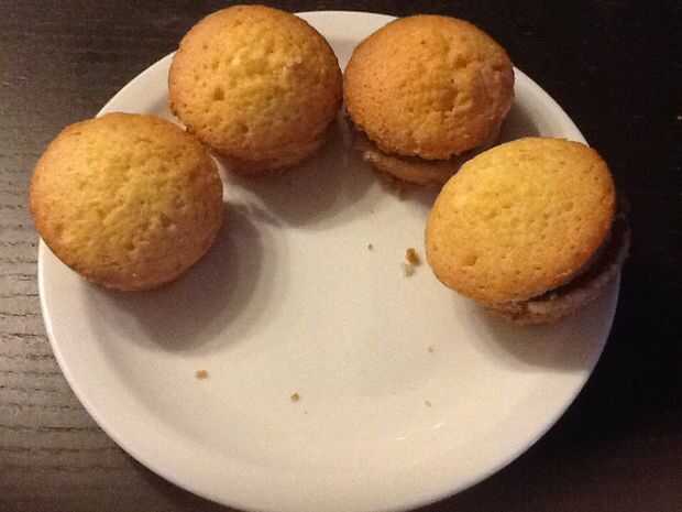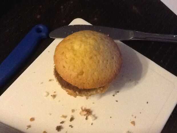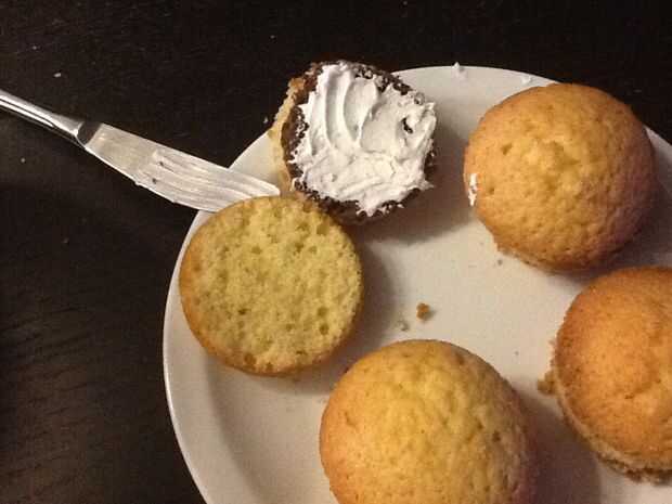 Cortar los Cupcakes de vainilla por la mitad y cortar la parte superior de los Cupcakes de Chocolate. Puede usar crema batida como mayo. ¡ Las galletas fritas hacia fuera y disfruta!