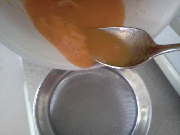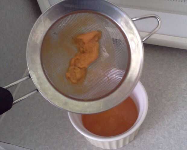 Usando un colador, cuele las pieles albaricoque hacia fuera por lo que sólo te queda con el líquido