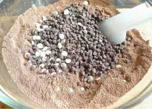 Con un revuelo de espátula de goma hasta que las chispas de chocolate oscuros y blanco se mezclan bien en los ingredientes secos.