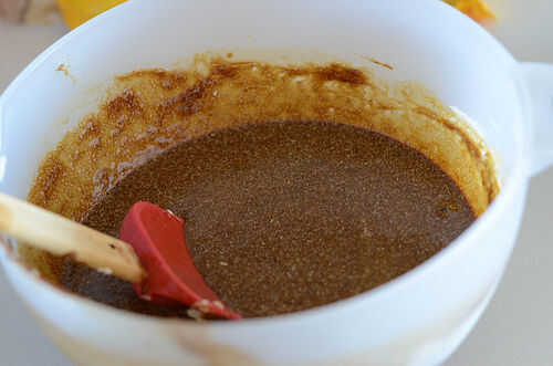4. en una taza combinar el bicarbonato de sodio con 1/2 taza de agua hirviendo y revolver la mezcla hasta disolver el bicarbonato de sodio. Revuelva la mezcla con la mezcla húmeda (la mezcla aparece cuajada).