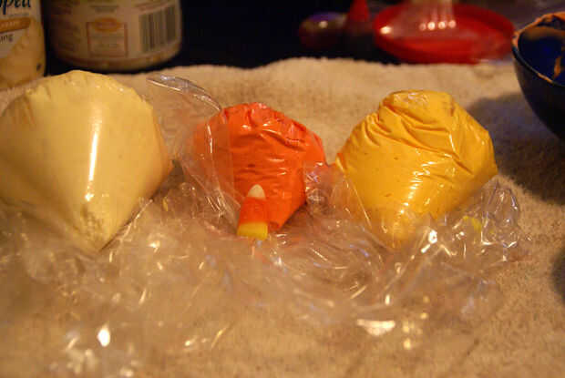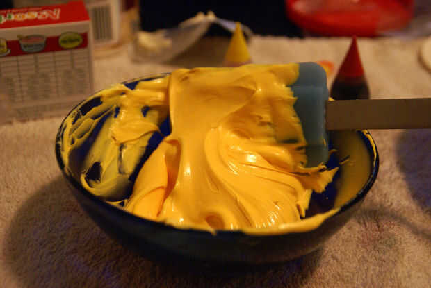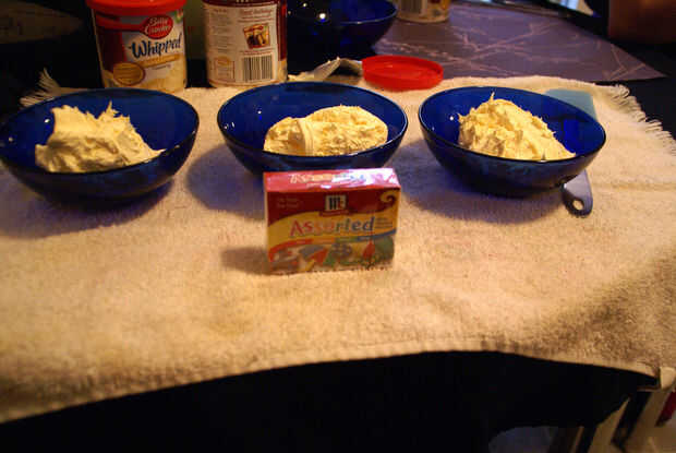 • Utilizar el glaseado blanco y dividir para arriba en tres tazones de fuente separados
