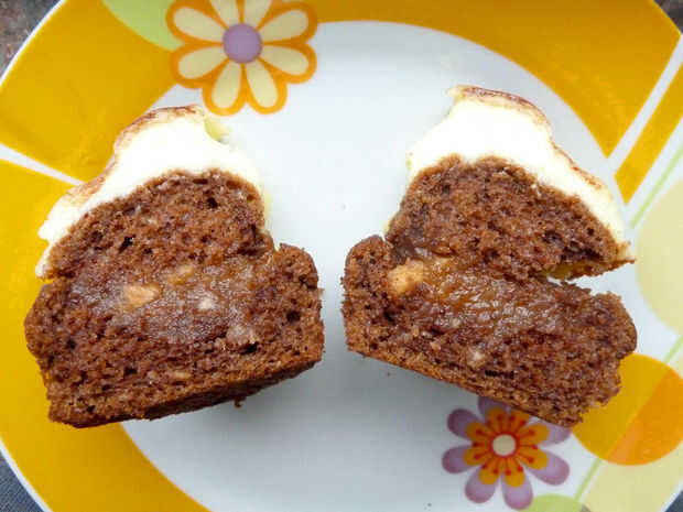 • Usando un cuchillo para cortar una forma del cono de la parte superior de cada cupcake. Coloque aproximadamente 1 cucharadita de confitura (mermelada de manzana, albaricoque o fresa) en el agujero vacío y luego suavemente la parte superior hacia atrás.